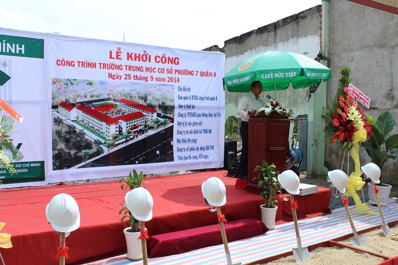 Ngày 25/9/2014, Ban Quản lý Đầu tư xây dựng công trình Quận 8 phối hợp cùng đơn vị thi công – CÔNG TY CỔ PHẦN XÂY DỰNG GIA THY long trọng tổ chức Lễ khởi công công trình Trường THCS Phường 7 – Quận 8. Đến tham dự buổi lễ có sự hiện diện của ông Lê Quỳnh Đài – Quận ủy viên, Phó Chủ tịch UBND Quận 8; bà Trần Thị Thu Thủy – Phó Chủ tịch ủy ban MTTQ Quận 8; bà Quách Thị Kim Phượng – Phó trưởng ban Dân vận quận ủy Quận 8; ông Trương Công Hầu – Phó ban Tuyên giáo quận ủy Quận 8; ông Trương Hạ Long – Giám đốc Ban QLĐTXDCT Quận 8; ông Huỳnh Quốc Thái – Bí thư Đảng ủy Phường 7, Quận 8; ông Nguyễn Văn Minh – Chủ tịch UBND Phường 7, Quận 8; ông Phan Hoàng Tuấn – Chủ tịch HĐQT Công ty Cổ phần Xây dựng Gia Thy - đại diện Nhà thầu thi công, cùng đại diện đơn vị Tư vấn giám sát, Tư vấnthiết kế.
